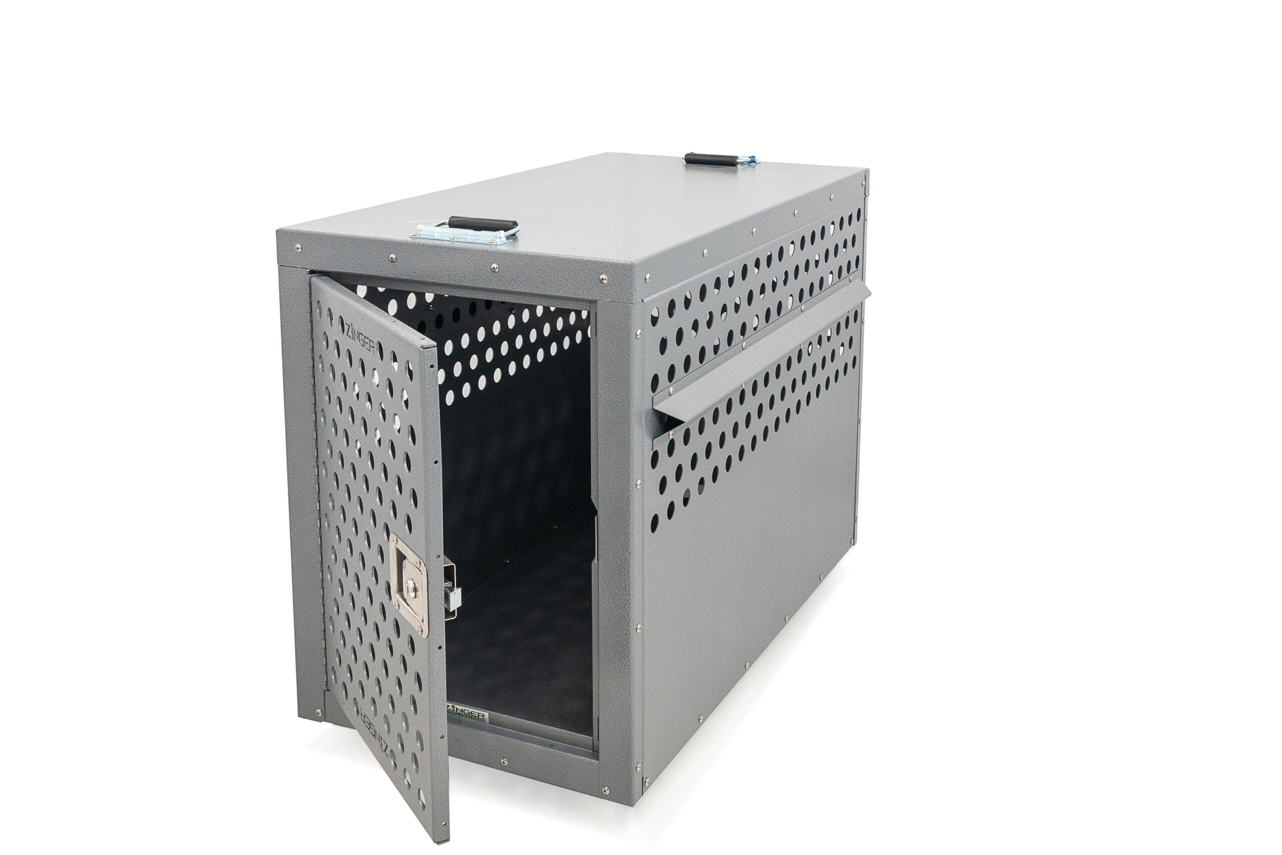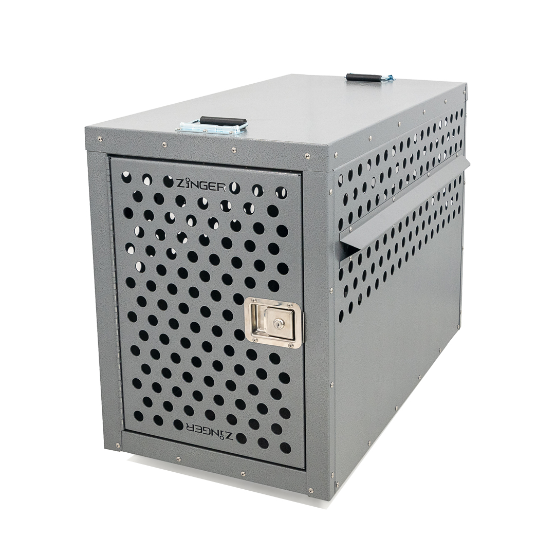 - Ventilation: A Zinger crate is fully vented on each side and along the top back wall to provide maximum comfort for your dog. Our open design allows air to pass freely thru the door aided by rows of vent holes which surround the crate. By its very nature aluminum quickly dissipates heat making it a great material to construct dog crates provided there are enough air holes. Lots of adequate venting ensures your dog will remain safe while in its crate.