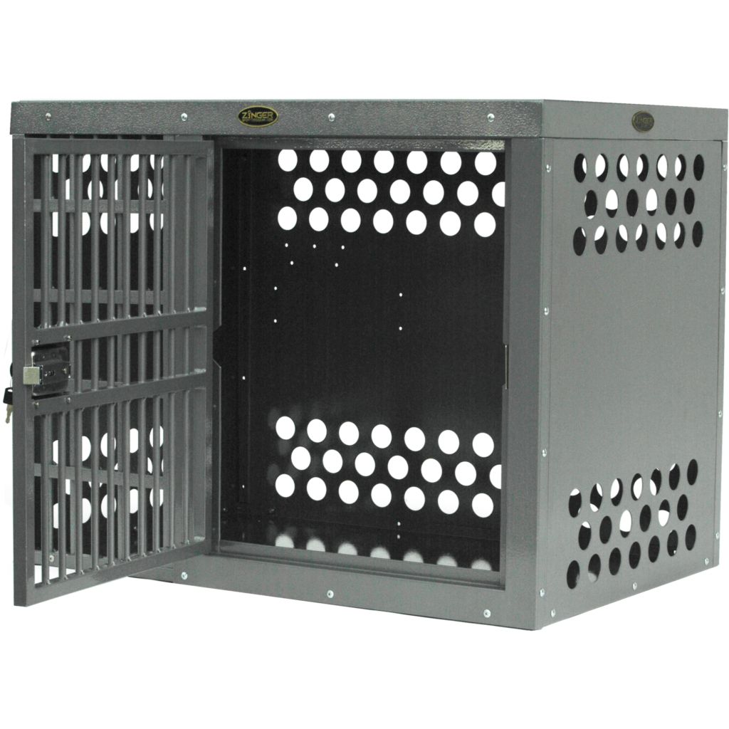- Ventilation: A Zinger crate is fully vented down each side and along the back wall to provide maximum comfort for your dog. Our open design allows air to pass freely thru the door aided by the triple rows of lower and upper vent holes which surround the crate. By its very nature aluminum quickly dissipates heat making it a great material to construct dog crates provided there are enough air holes. Lots of adequate venting ensures your dog will remain safe while in its crate.
