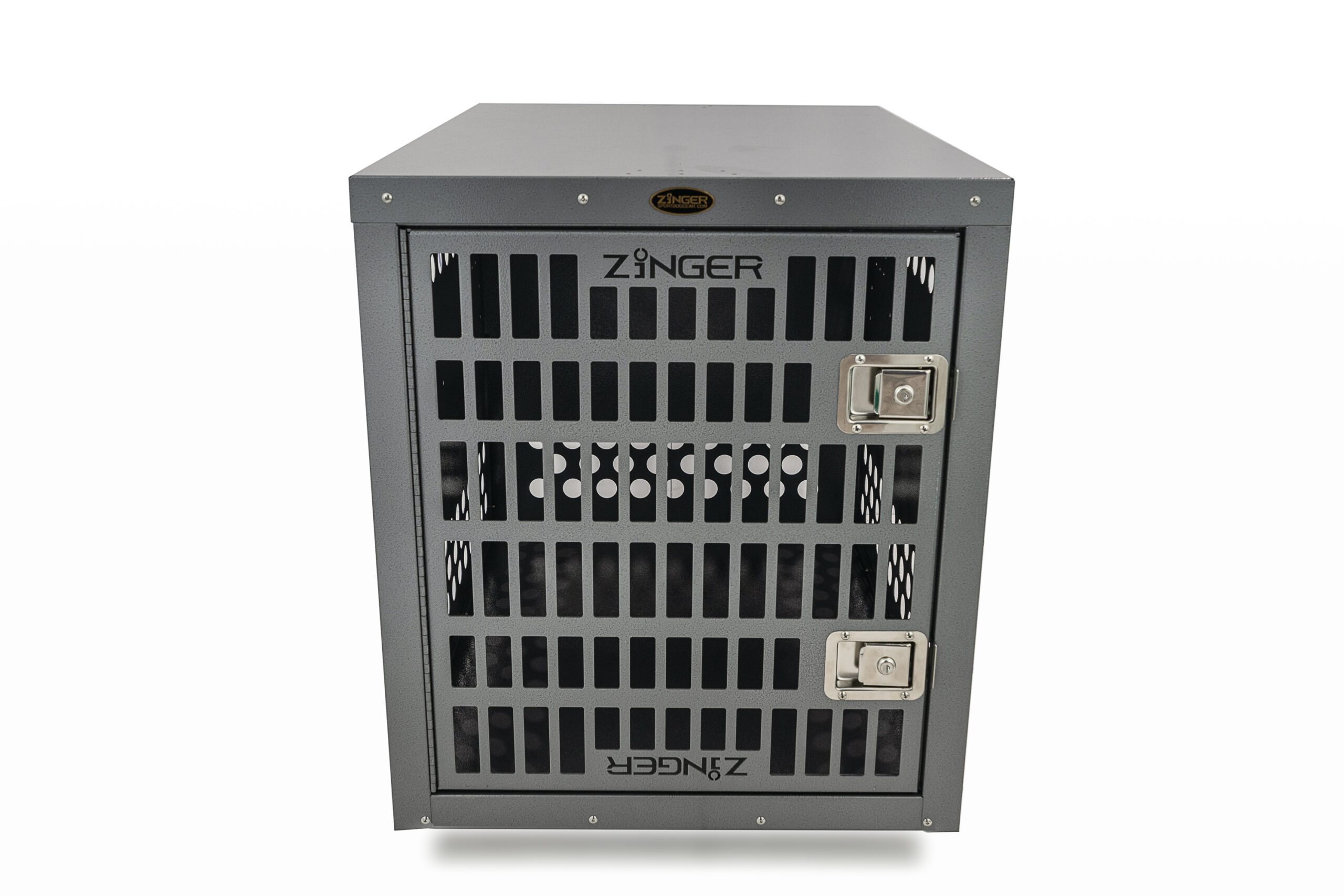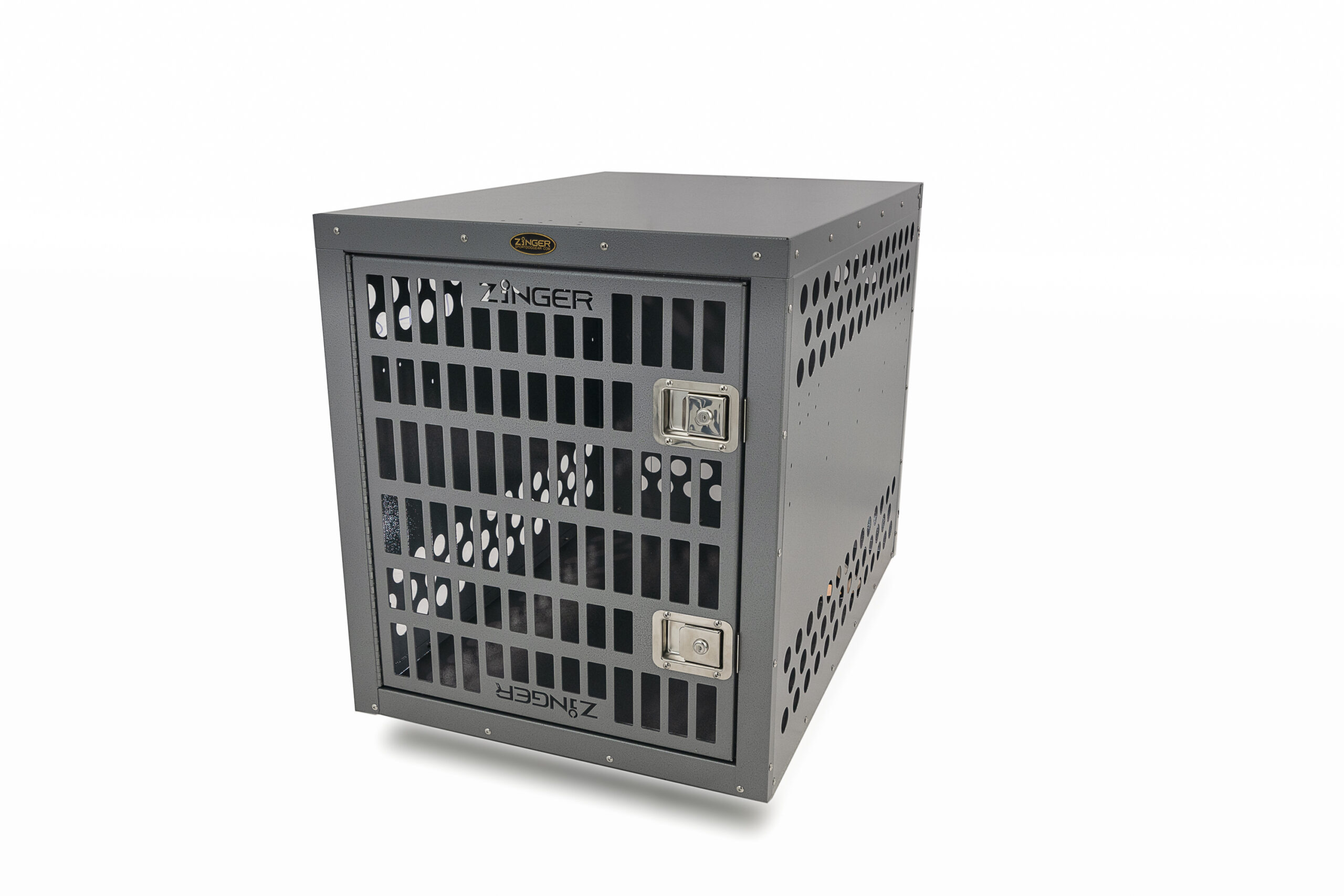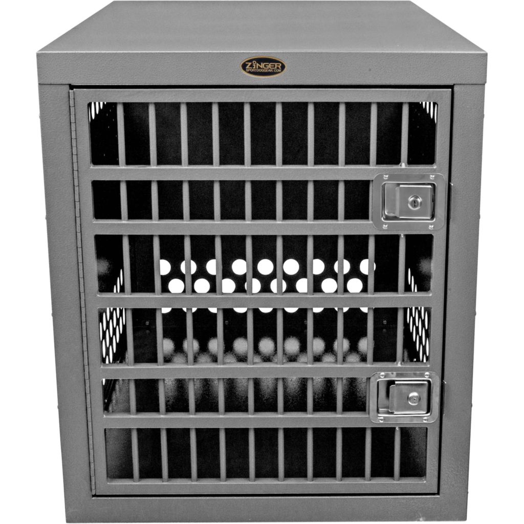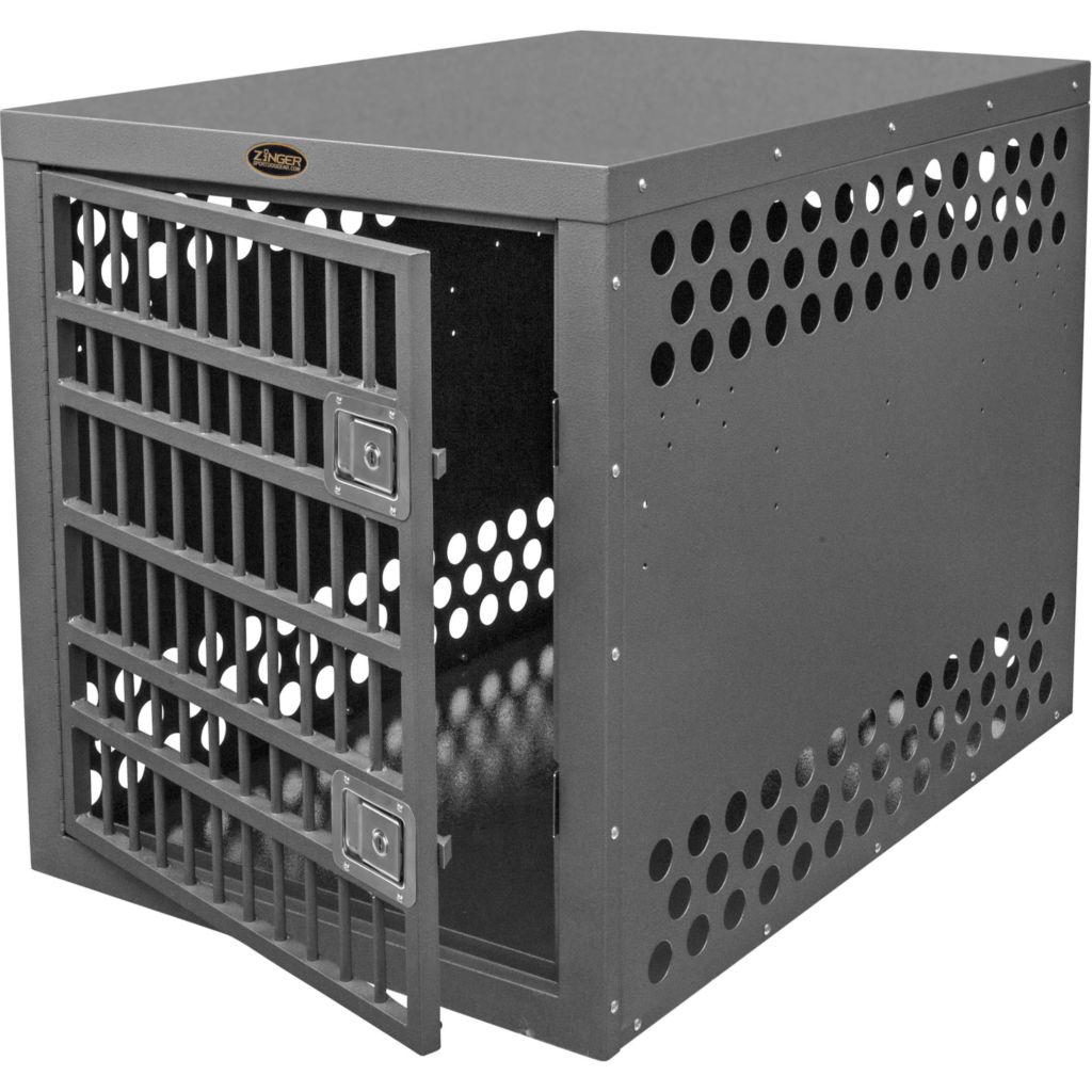 - Ventilation: A Zinger crate is fully vented down each side and along the back wall to provide maximum comfort for your dog. Our open design allows air to pass freely thru the door aided by the triple rows of lower and upper vent holes which surround the crate. By its very nature aluminum quickly dissipates heat making it a great material to construct dog crates provided there are enough air holes. Lots of adequate venting ensures your dog will remain safe while in its crate.
