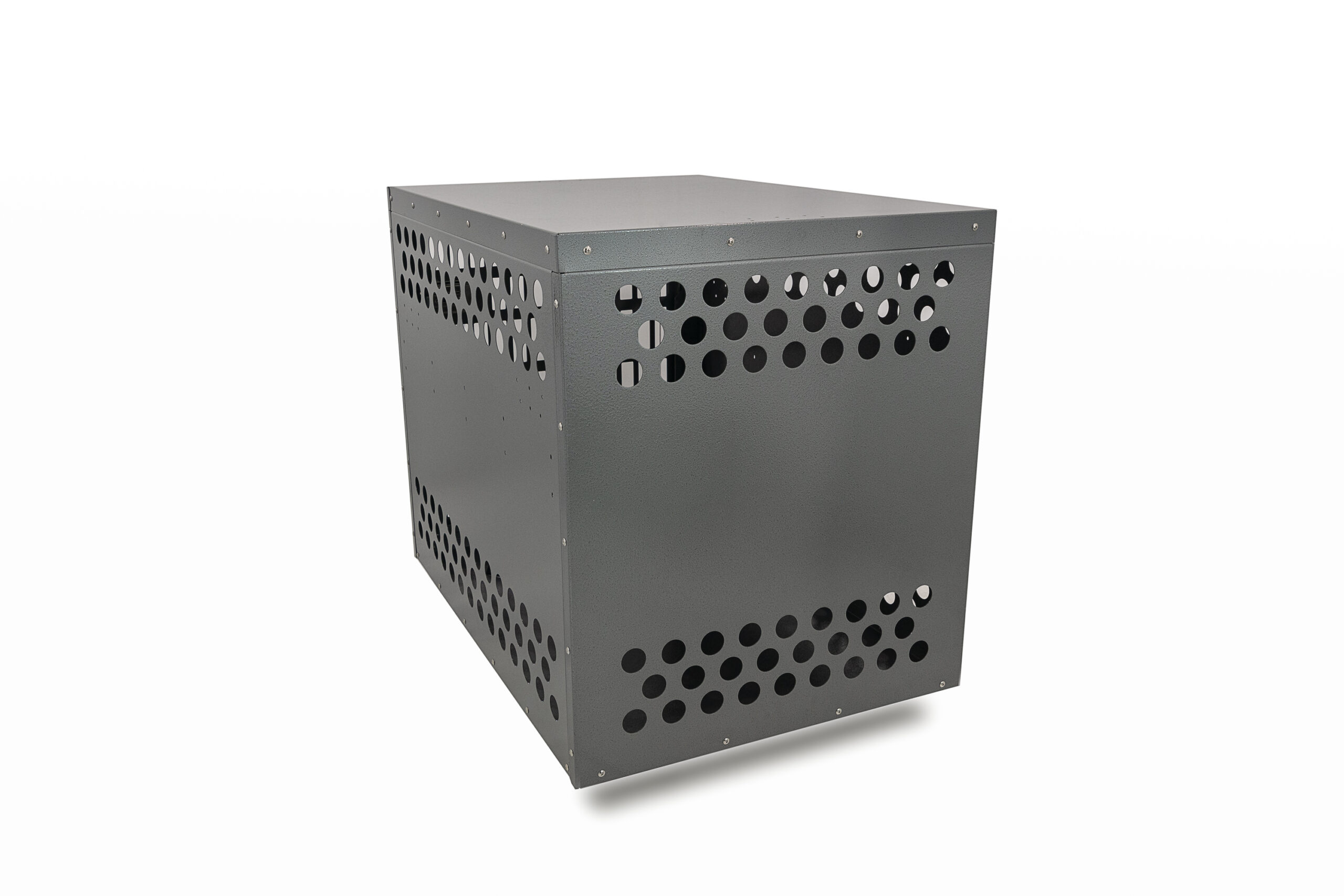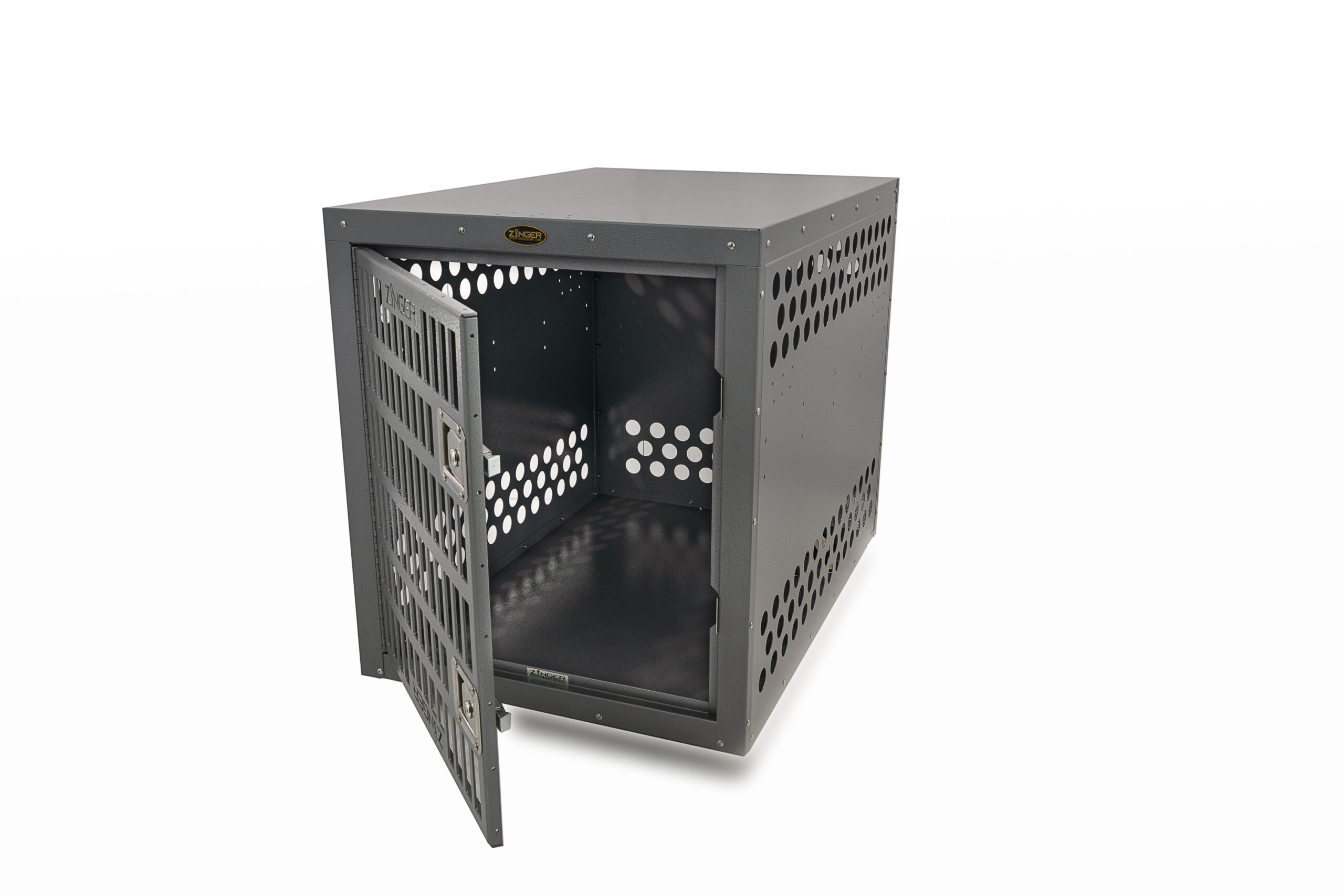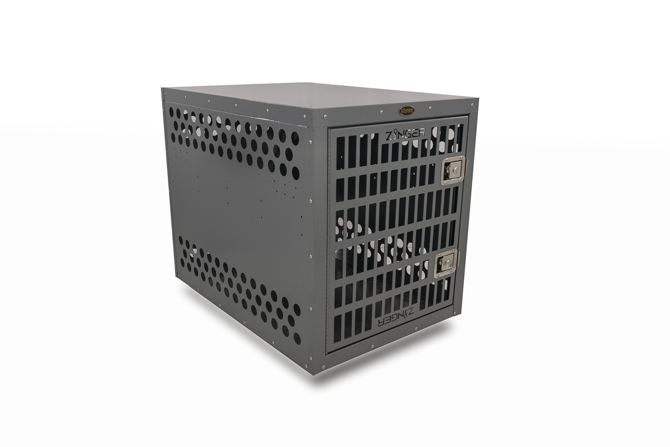 - Ventilation: A Zinger crate is fully vented down each side and along the back wall to provide maximum comfort for your dog. Our open design allows air to pass freely thru the door aided by the triple rows of lower and upper vent holes which surround the crate. By its very nature aluminum quickly dissipates heat making it a great material to construct dog crates provided there are enough air holes. Lots of adequate venting ensures your dog will remain safe while in its crate.