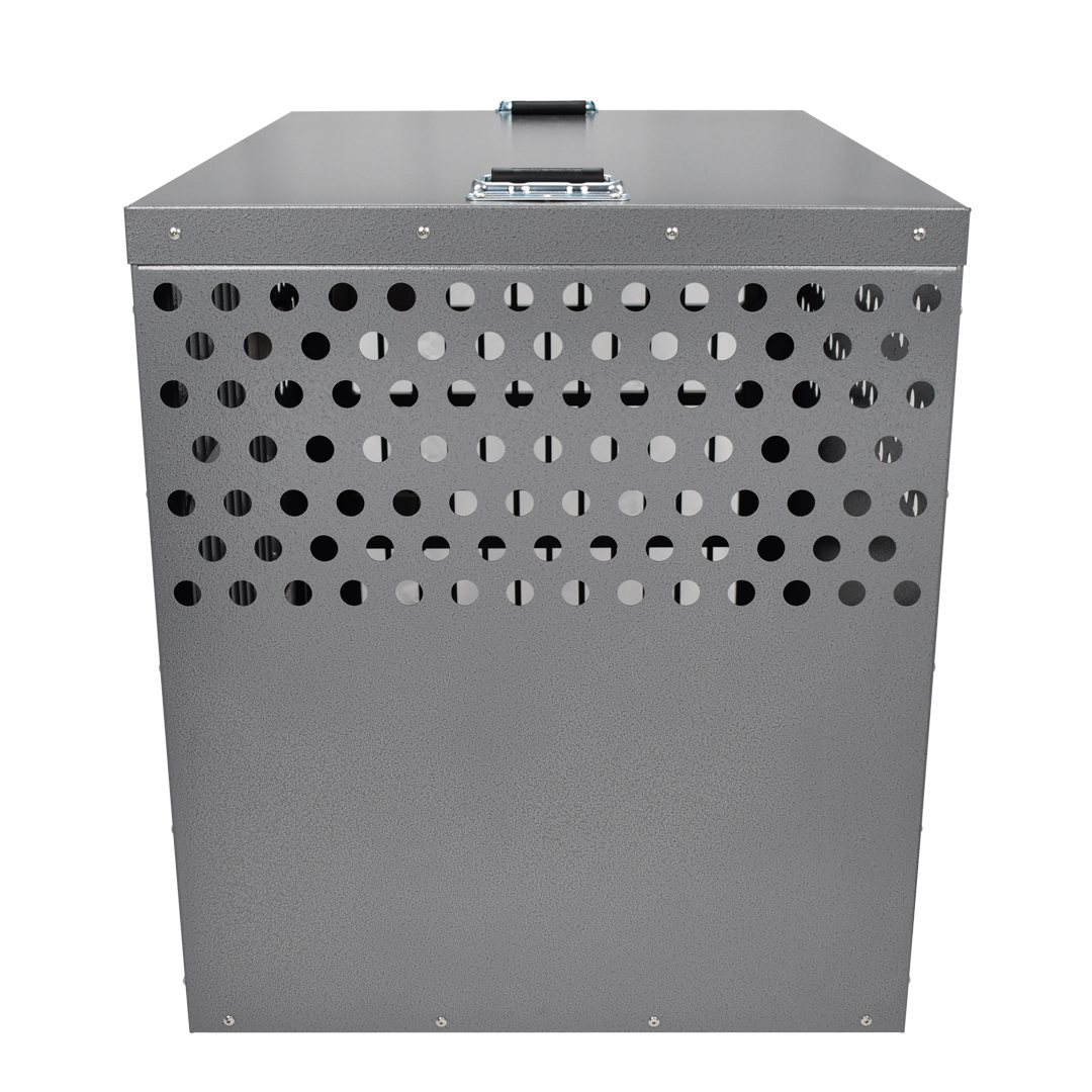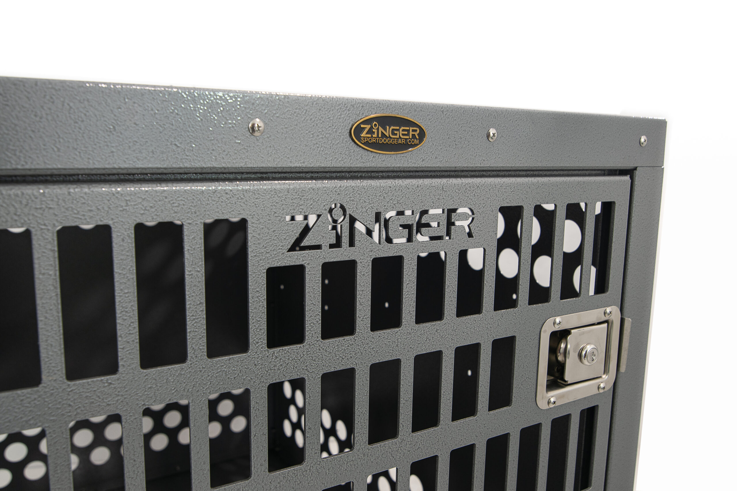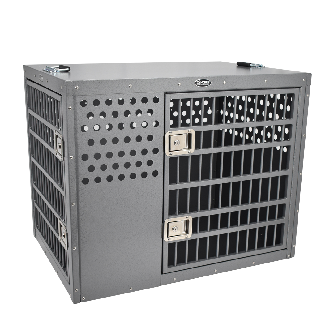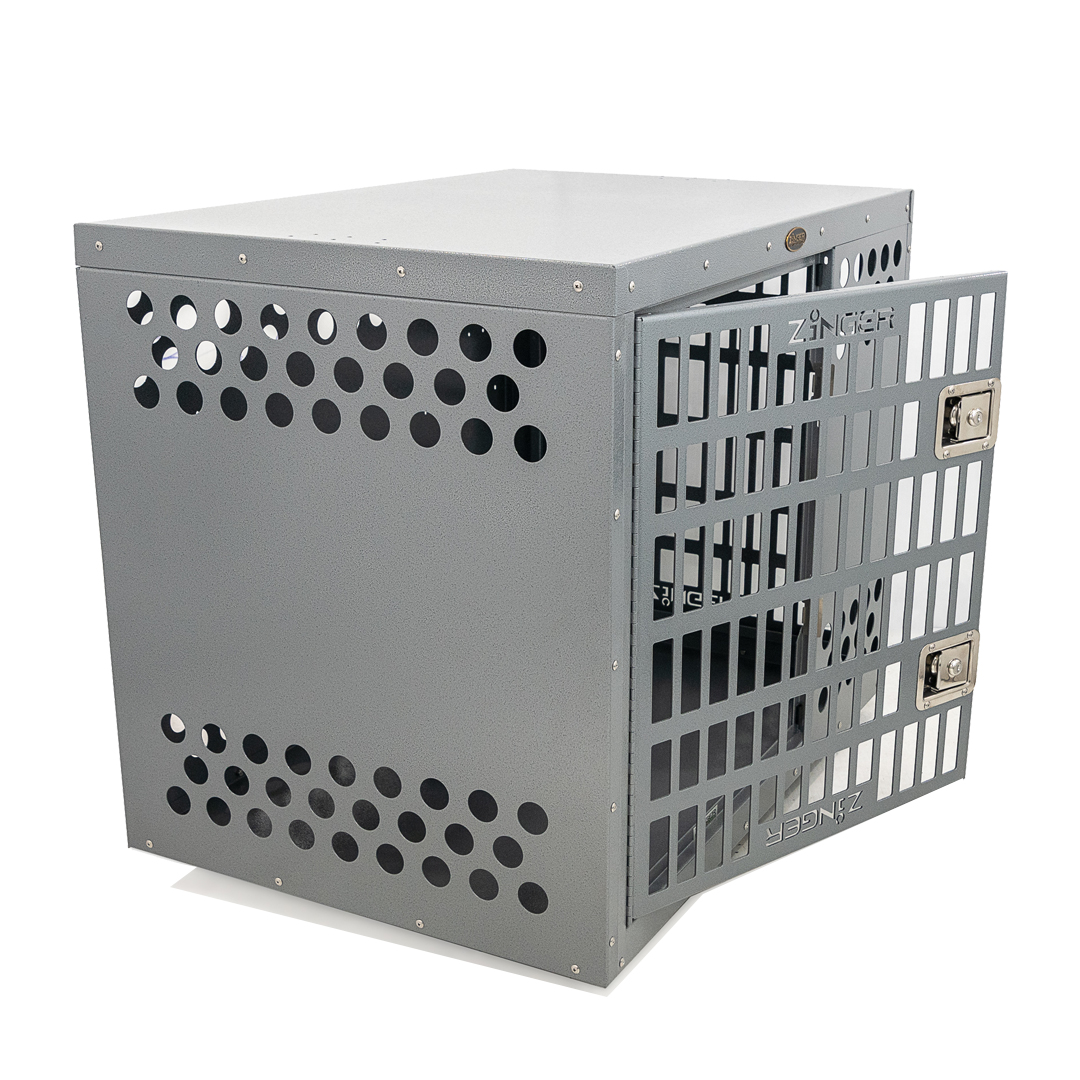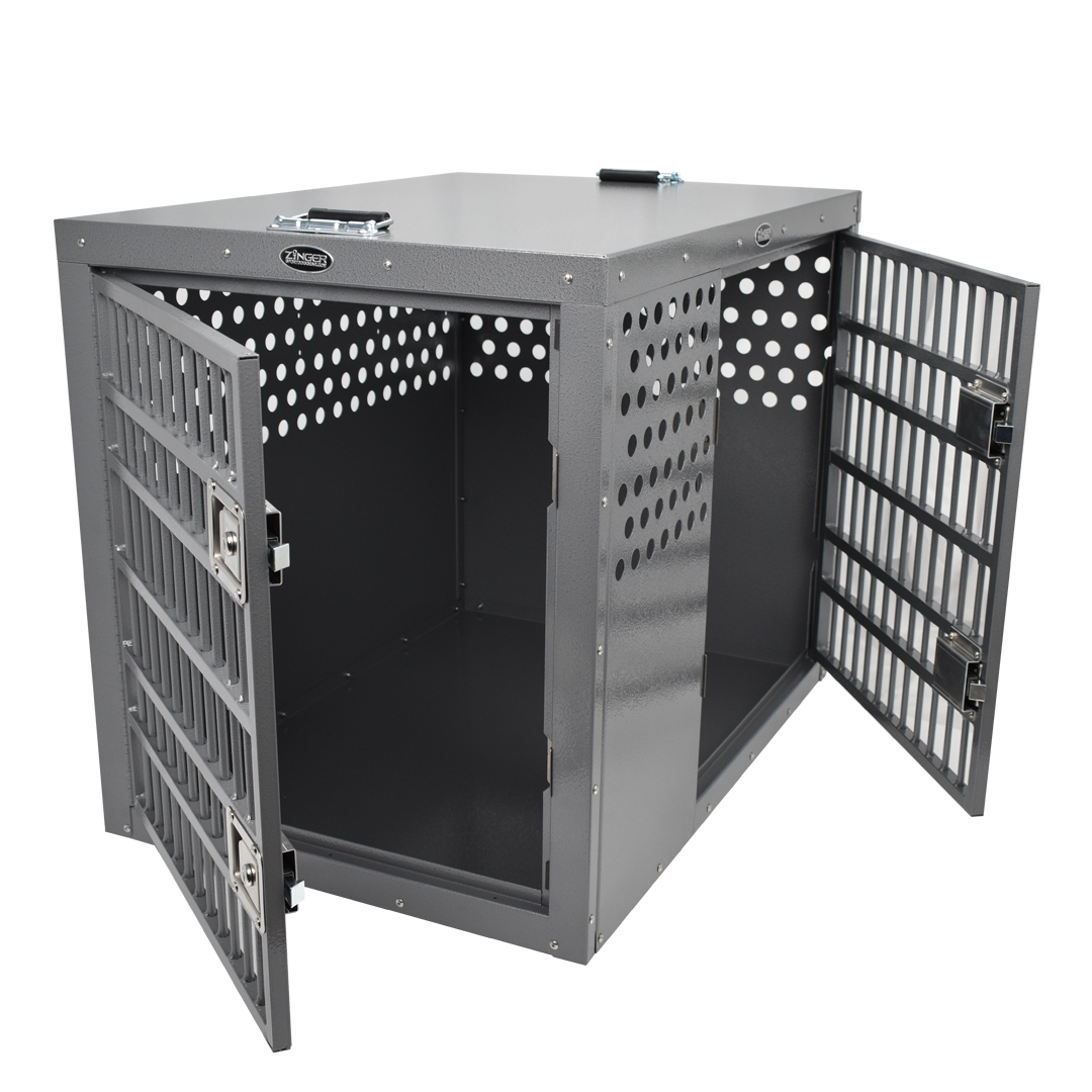 - Ventilation: A Zinger crate is fully vented down each side and along the back wall to provide maximum comfort for your dog. Our open design allows air to pass freely thru the door aided by the triple rows of lower and upper vent holes which surround the crate. By its very nature aluminum quickly dissipates heat making it a great material to construct dog crates provided there are enough air holes. Lots of adequate venting ensures your dog will remain safe while in its crate.