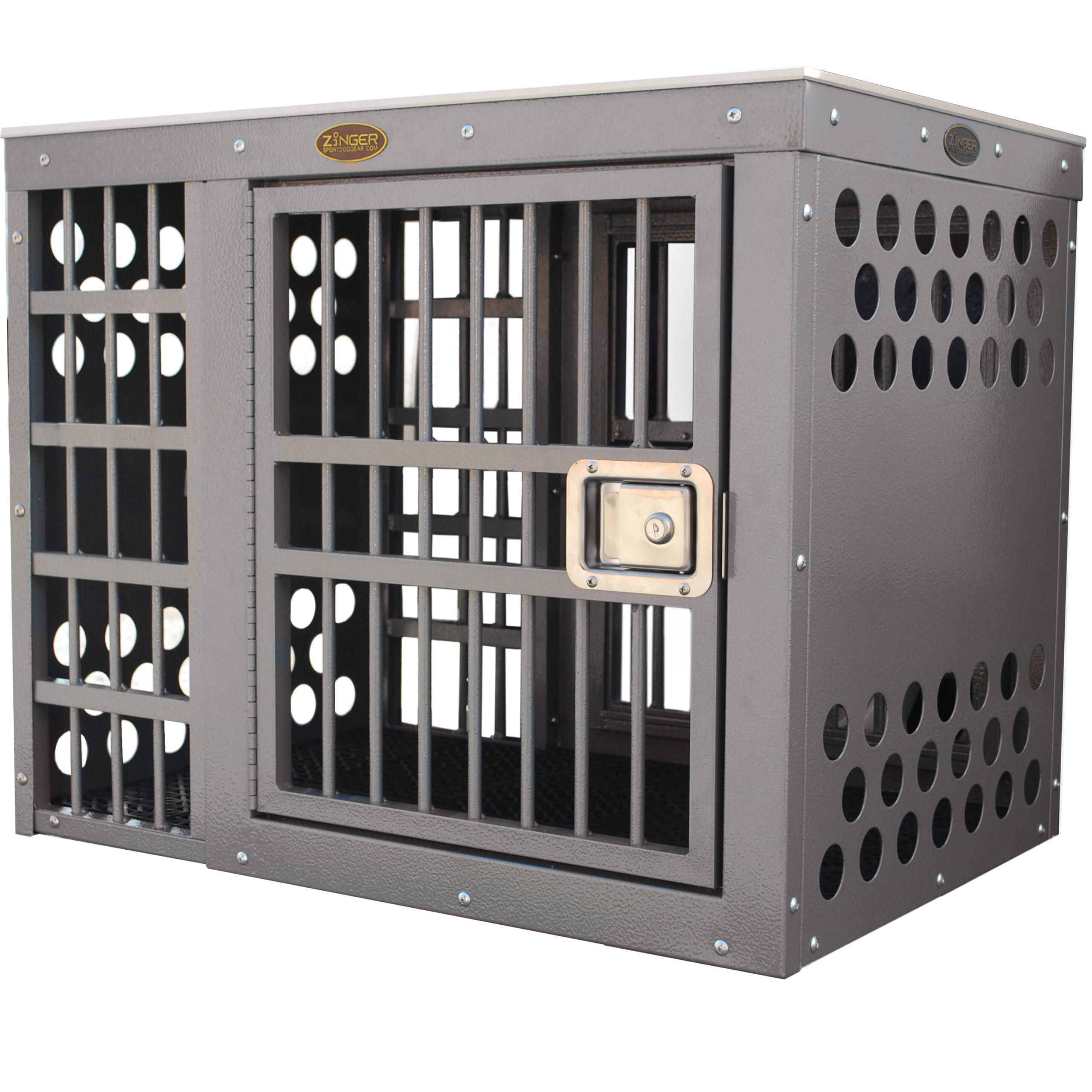 • Ventilation: A Zinger crate is fully vented down each side to provide maximum comfort for your dog. Our open design allows air to pass freely thru the door aided by the triple rows of lower and upper vent holes which surround the crate. By its very nature aluminum quickly dissipates heat making it a great material to construct dog crates provided there are enough air holes. Lots of adequate venting ensures your dog will remain safe while in its crate.